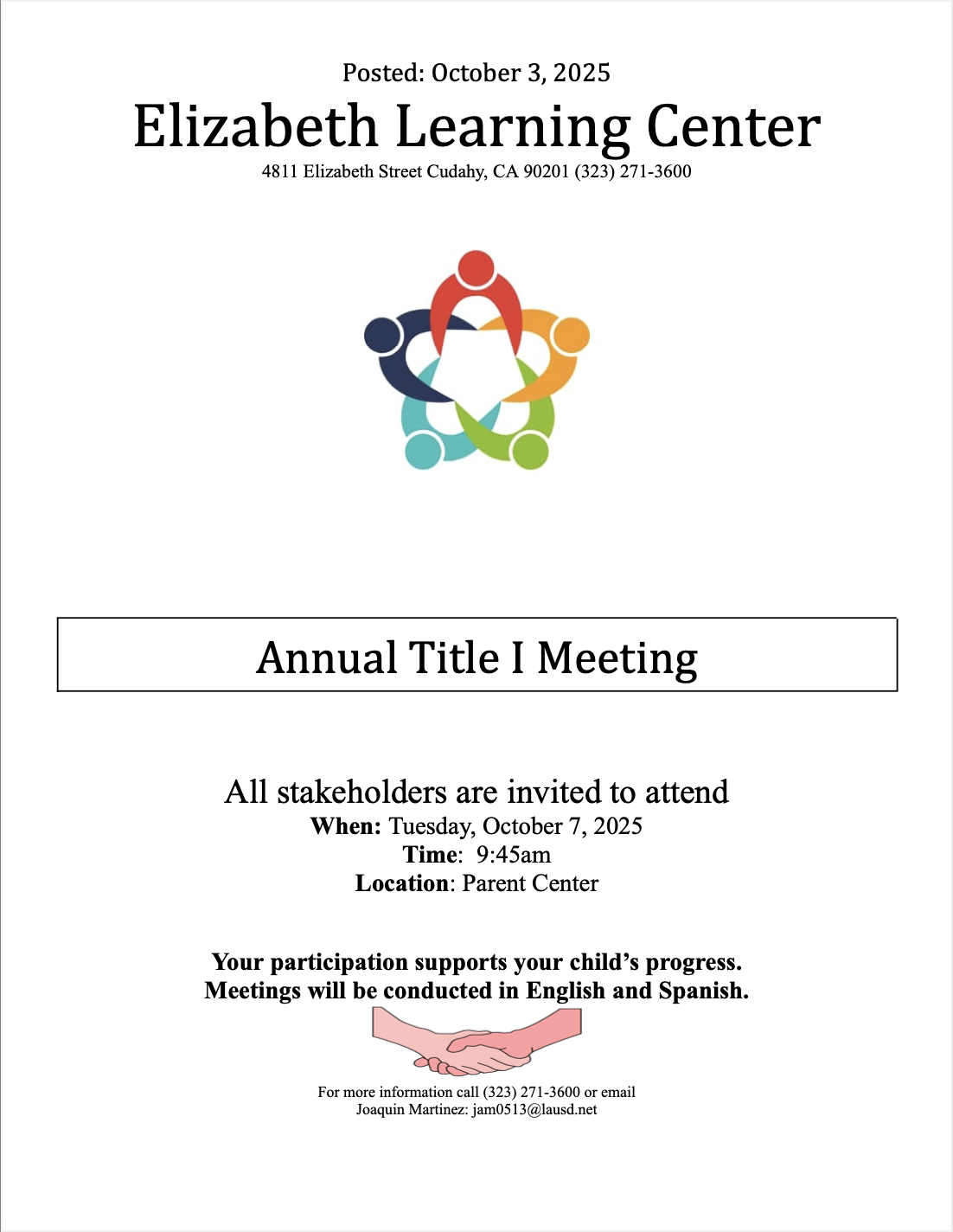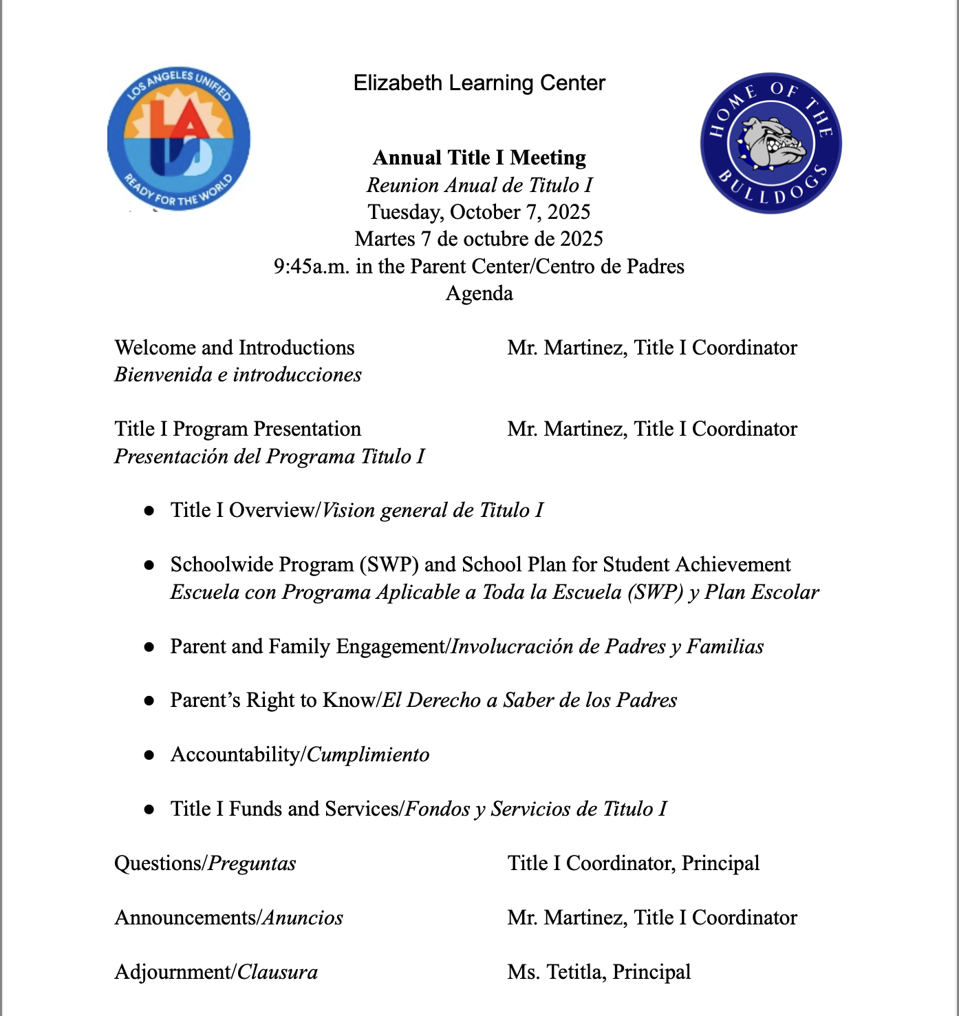 Annual Title I Meeting / Reunion Annual de Titulo I Attached Files (Eng) Annual Title I Meeting Parent Letter.pdf (Spn) Annual Title I Parent Letter.pdf Annual Title I Meeting Agenda.pdf