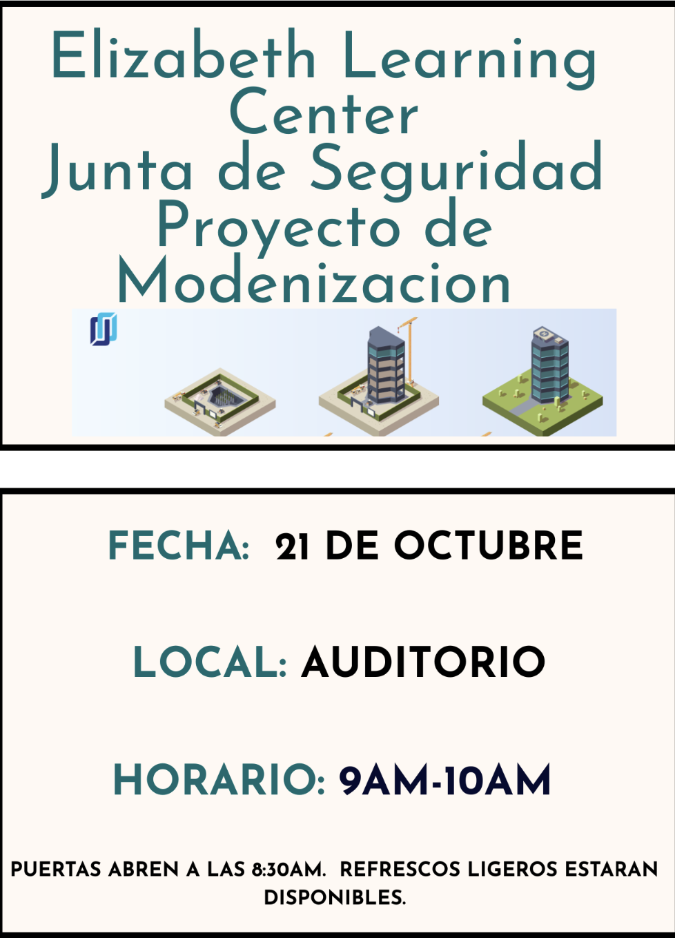 Safety Meeting Modernization Project / Junta Comunitaria Proyecto de Modenizacion Attached Files ELC Safety Meeting Modernization Project.pdf ELC Safety Meeting Modernization Project (Span).pdf